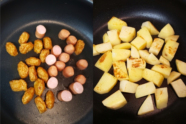 ソーセージは油なしでジャガイモは油をひいて色がつくまで焼きます。