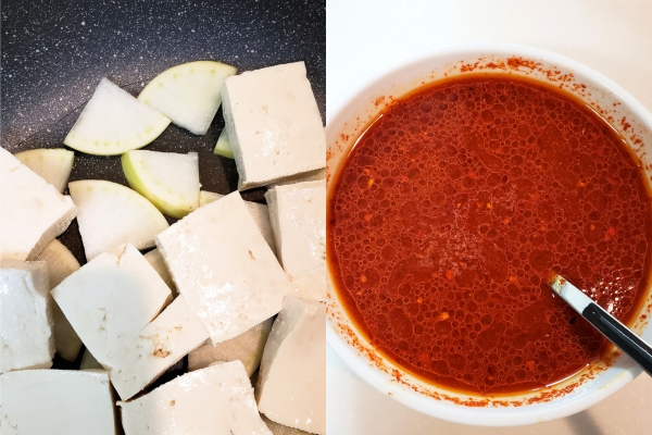 豆腐は約1.5cm幅に、大根は約0.5cmに切り、油は引かず大根→豆腐順に並べます。
